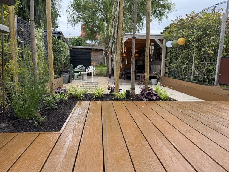 Tuin opgeleverd in Weesp Nieuwbouw, maar dan nét even anders. Geen rechte lijnen, maar een…